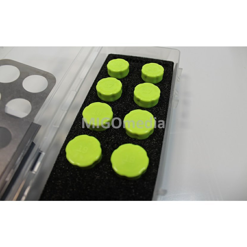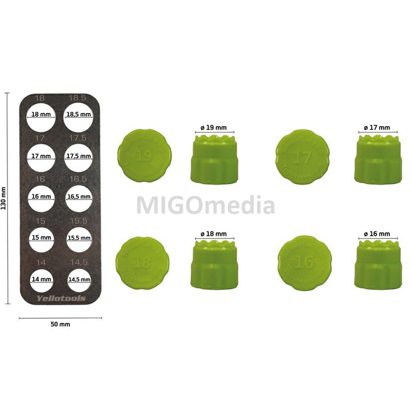 Šablóna SensorCut má 10 rôznych veľkostí: 14,0 mm 14,5 mm 15,0 mm 15,5 mm 16,0 mm 16,5 mm 17,0 mm 17,5 mm 18,0 mm 18,5 mm