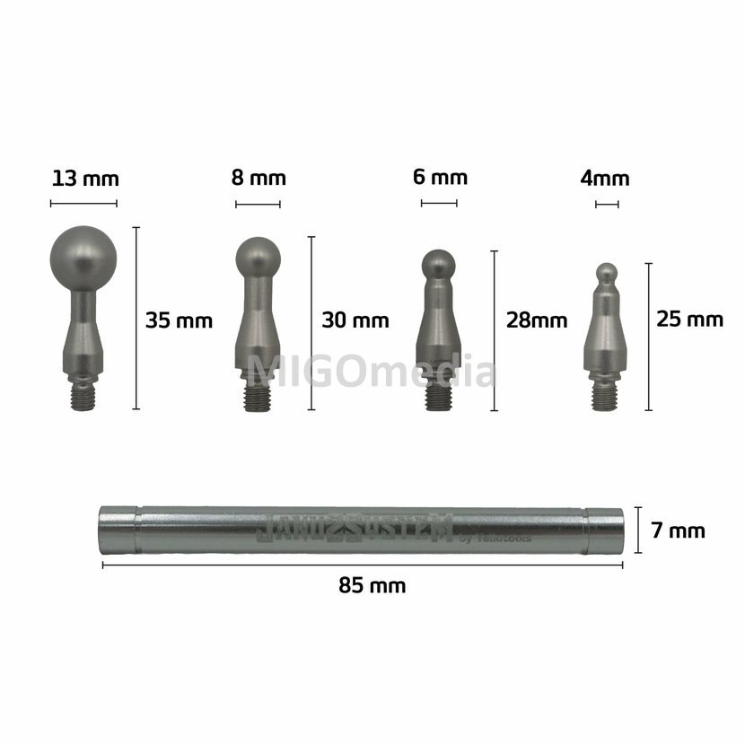 - 4 hliníkové guľové hlavice (Ř 4, 6, 8 a 13 mm) – eloxovaný hliník najvyššej kvality